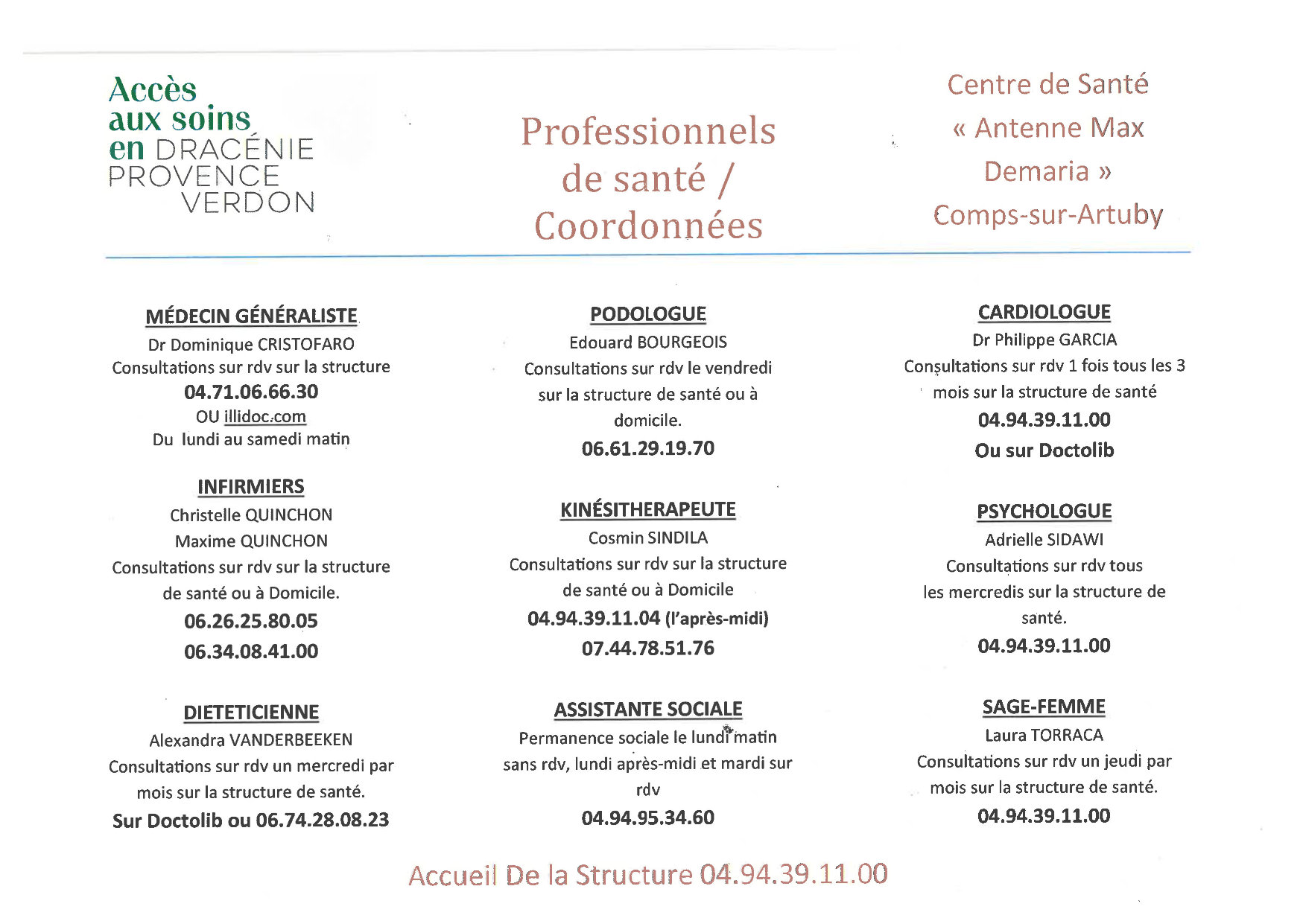 Modalités de prise de rendez vous et horaires de consultations des professionnels de la Maison de Santé Pluridisciplinaire de Comps sur Artuby